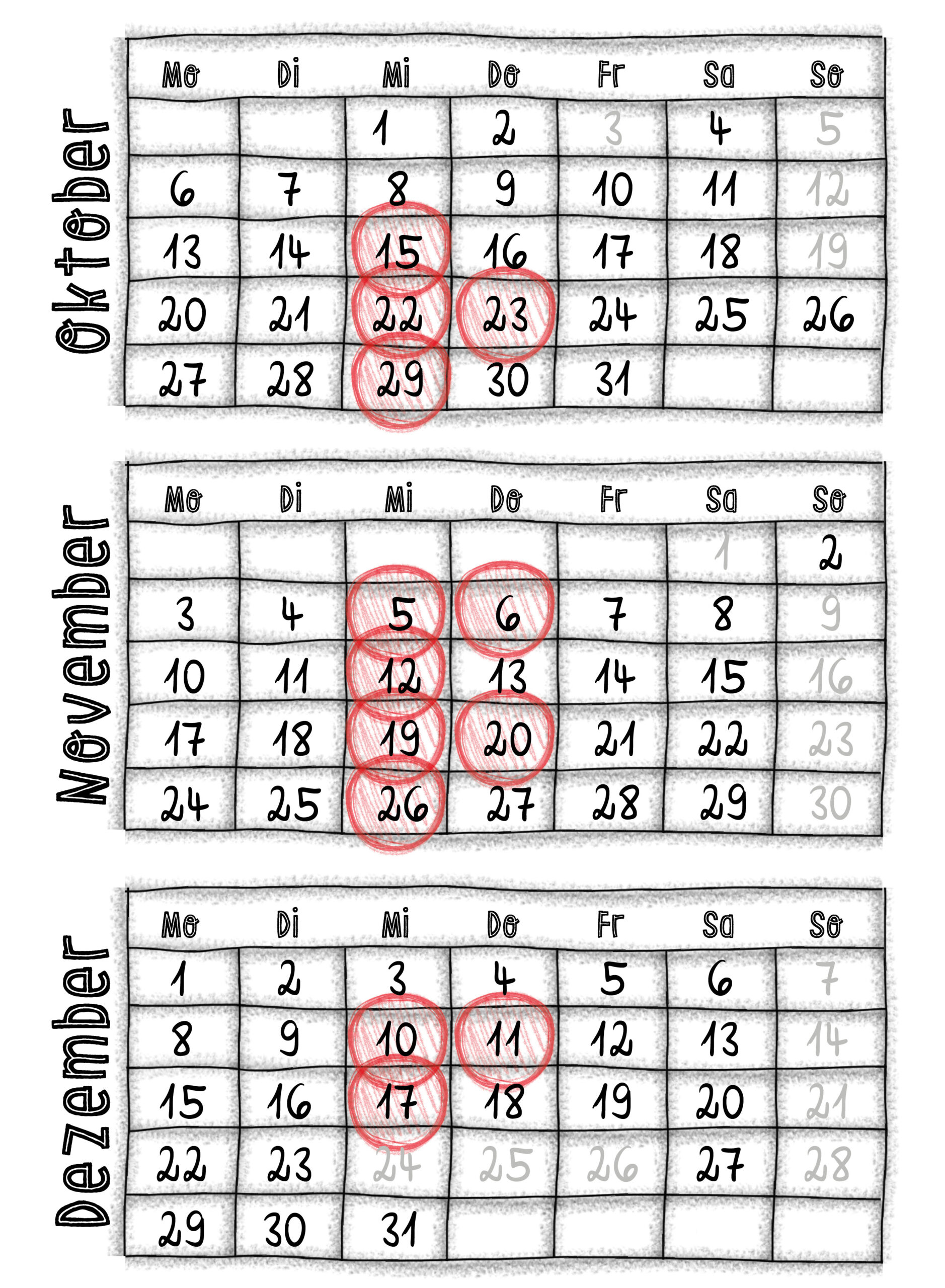 Auch hier gilt: Ruf ein­fach kurz an oder schreib eine Mail, wenn Du einen Ter­min aus­ma­chen möch­test oder Fra­gen hast: tele­fo­nisch (0177–7977140) oder per Mail an beate@ideenhoch3.de.