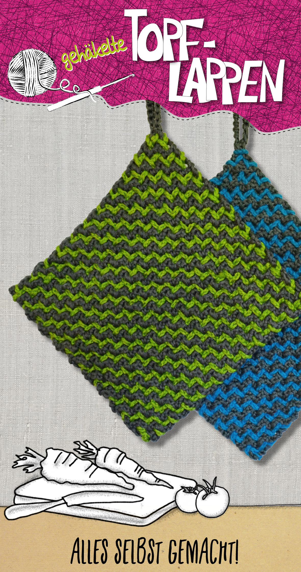 ausnahmsweise wird hier mal gehäkelt und nicht genäht. Und zwar Topflappen, die was taugen: Sie bestehen aus einem Filet-Gitter und darin eingewebten Luftmaschenketten. Dadurch bieten die Topflappen lückenlosen Schutz.